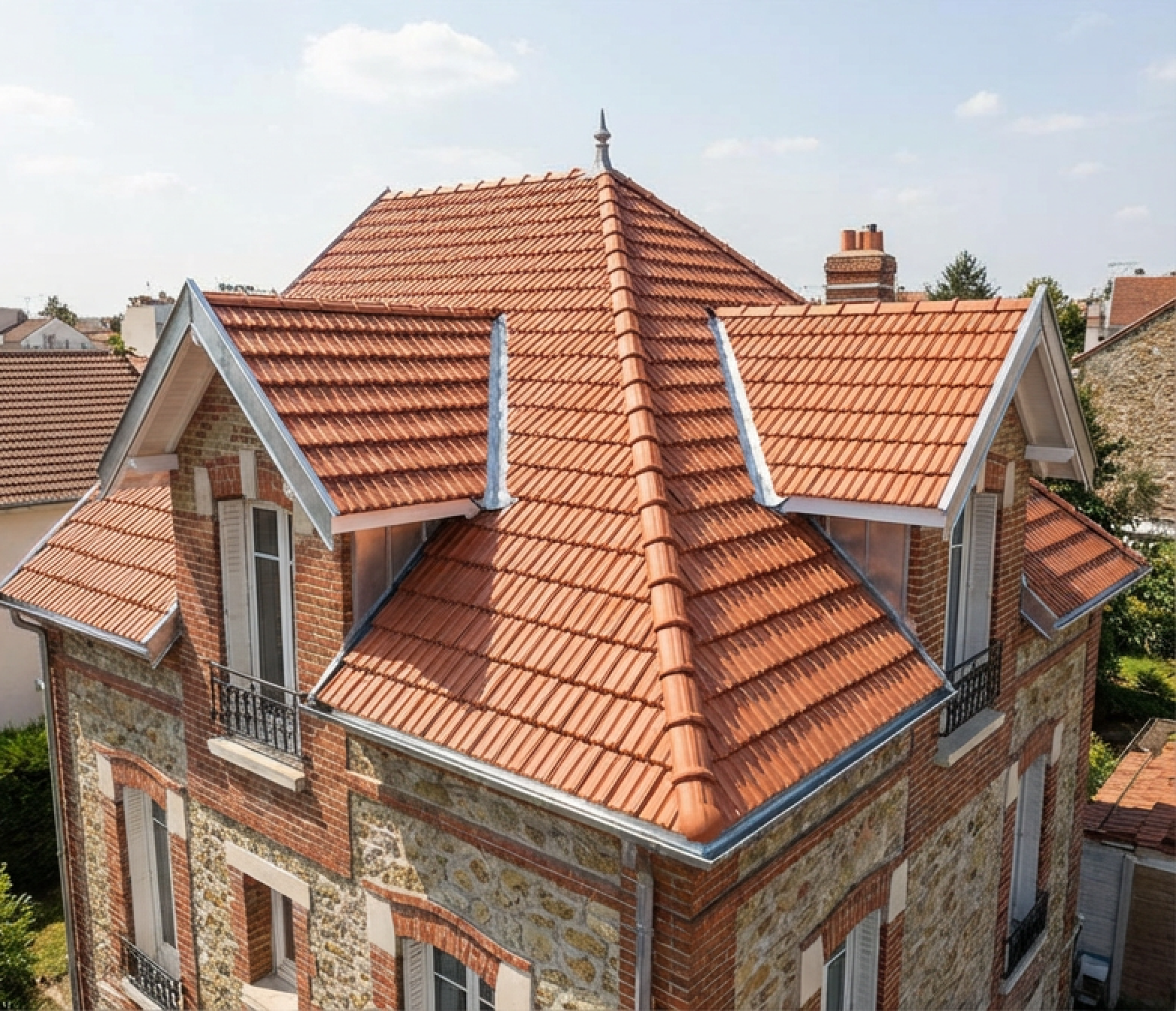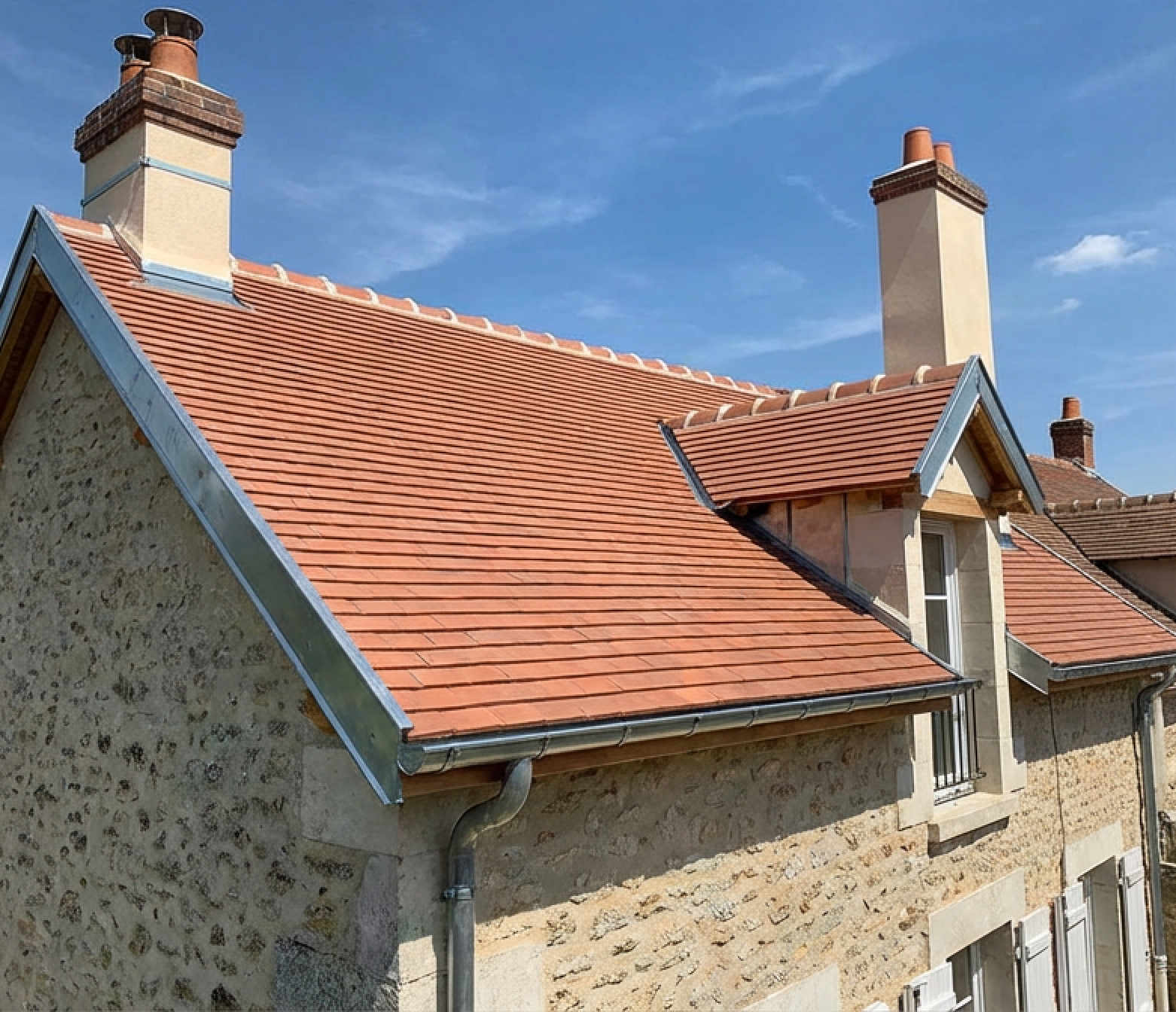 Réfection tuiles terre cuite, zinguerie, cheminées et gouttières.